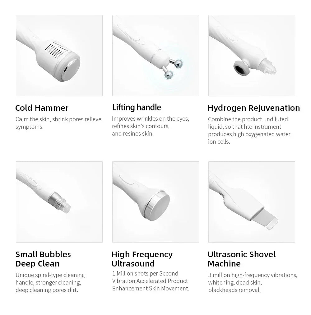 Multi functional design: Equipped with 6 probes with different functions, including water grinding pen, scraper, ultrasonic, RF radio frequency, spray pen and ice hammer, which can meet the precise cleaning and care needs of different skin parts and requirements.